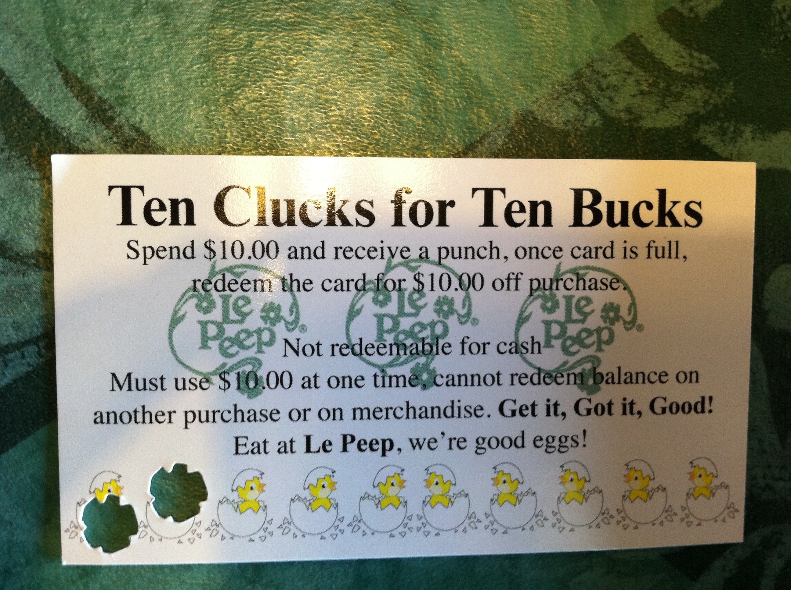 Price: The price is on the higher side of equivalent restaurants. The portions are generous and the quality is there, but you might be looking at over $10 by the time you add coffee or a side. They do have a loyalty punch card (Clucks for Bucks) that offers a $10 credit after spending $100 (through combined visits). We were glad we visited on a Tuesday, seeing that Tuesdays are double punch days. It’s not something we would particularly go to Le Peep for, but if you’re spending the money you might as well.