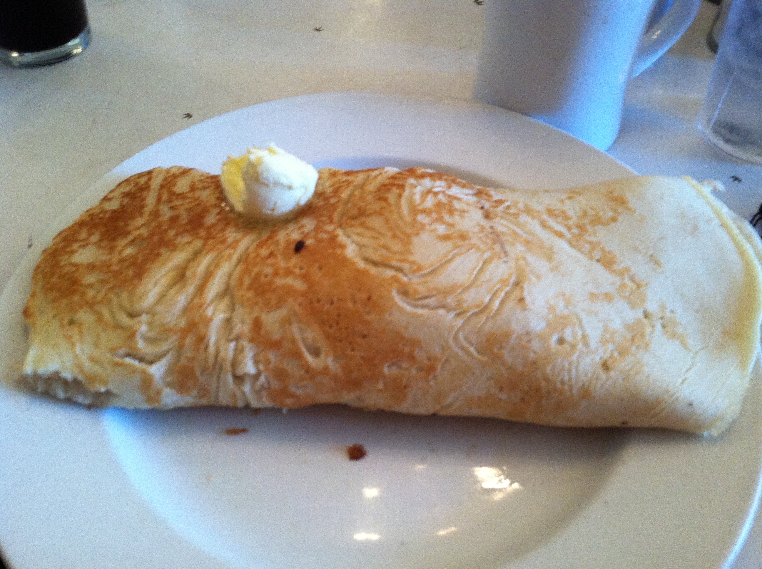This burrito has love in it. I like to think of the love was named after the foot in diameter pancake. This pancake is the what holds this meal together, literally and metaphorically. The contents of this burrito are crispy bacon, scrambled eggs, and cheese. This burrito is everything you usually have for breakfast wrapped up in a loving burrito. I am a big fan of this burrito of love. There was only one thing that I struggled with in this burrito, and that was the bacon. The bacon was so crispy that it was hard to cut reasonably. I had to take the bacon out and eat it separately; which isn’t a bad thing at all, it’s bacon. The rest of this meal was incredibly enjoyable. The pancake was perfectly cooked. I am astonished with how well it was cooked, due to its size. The burrito of love is conveniently priced at $7.