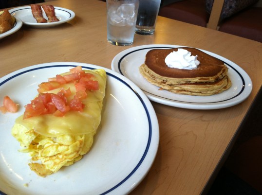This is my go-to order at IHOP. It is the build-your-own-omelette. This include a burrito sized omelette with 3 pancakes, all for $5.99. You can add toppings to your omelette for 59 cents each. I added fresh tomatoes to make it “healthy”. IHOP has a nice array of different syrups: Old-Fashioned, Blueberry, Strawberry, Butter Pecan, and my favorite Boysenberry. The pancakes I had were of the pumpkin variety. The pumpkin pancakes are not on the IHOP menu all-year. They are one of their seasonal pancakes. IHOP’s menu is always changing because of the seasonal items which is a +. These did not have a dollop of butter, but a swirl of whipped cream with cinnamon on it. These pancakes were very good. It had a creamy texture with a nice nutmeg-y twist. These pancakes being of a savory flavor would not be a good pairing with a fruity syrup. I used butter pecan syrup.