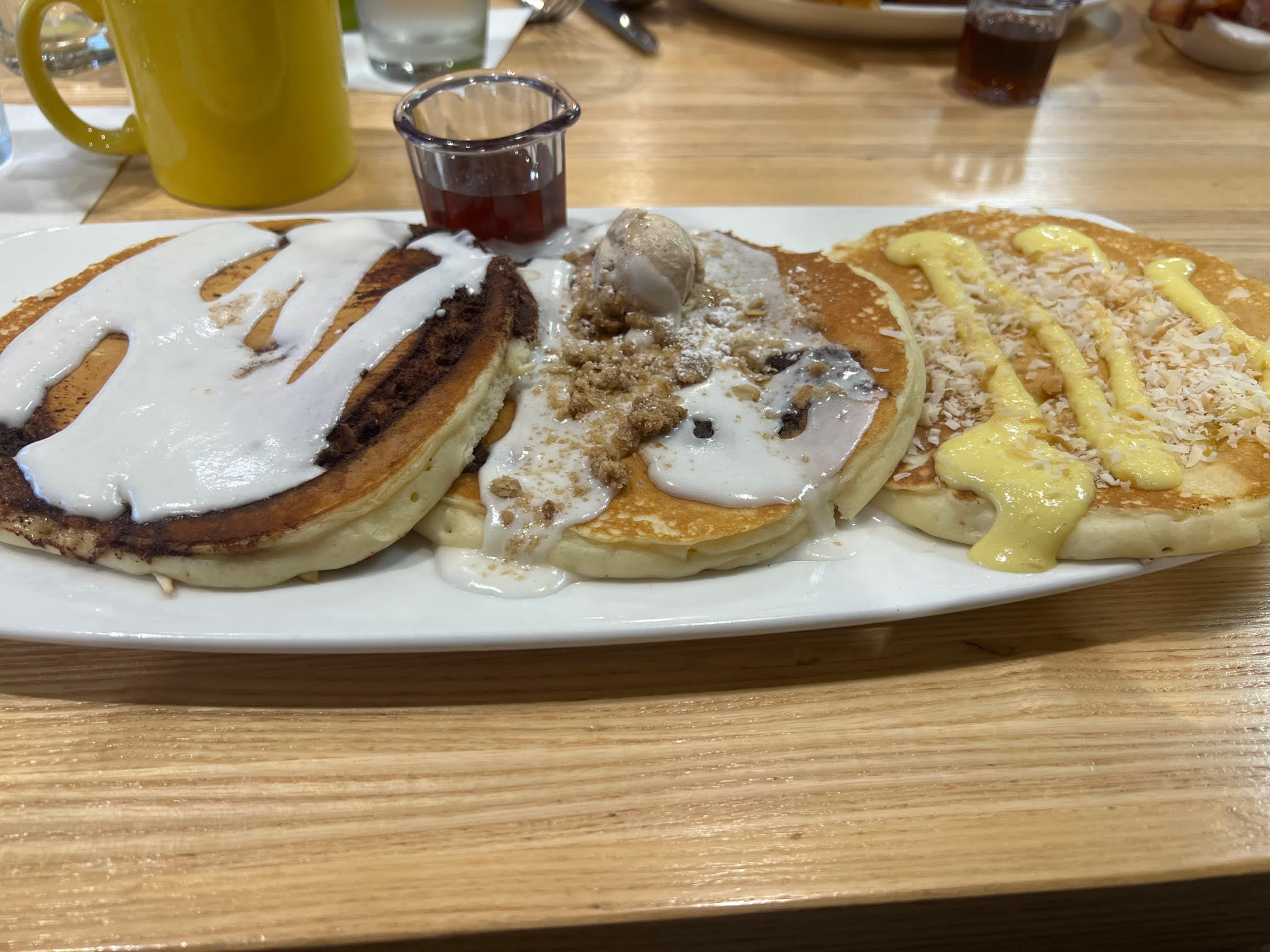 I tried the Gourmet Pancake Flight! A flight is a variety of items that I believe began in breweries. You can try a plethora of items without committing to a full pour/stack. The first time I saw a pancake flight on a menu was at Snooze in Denver. But I am so happy to see this phenomenon of a menu item be spread around the breakfast world.