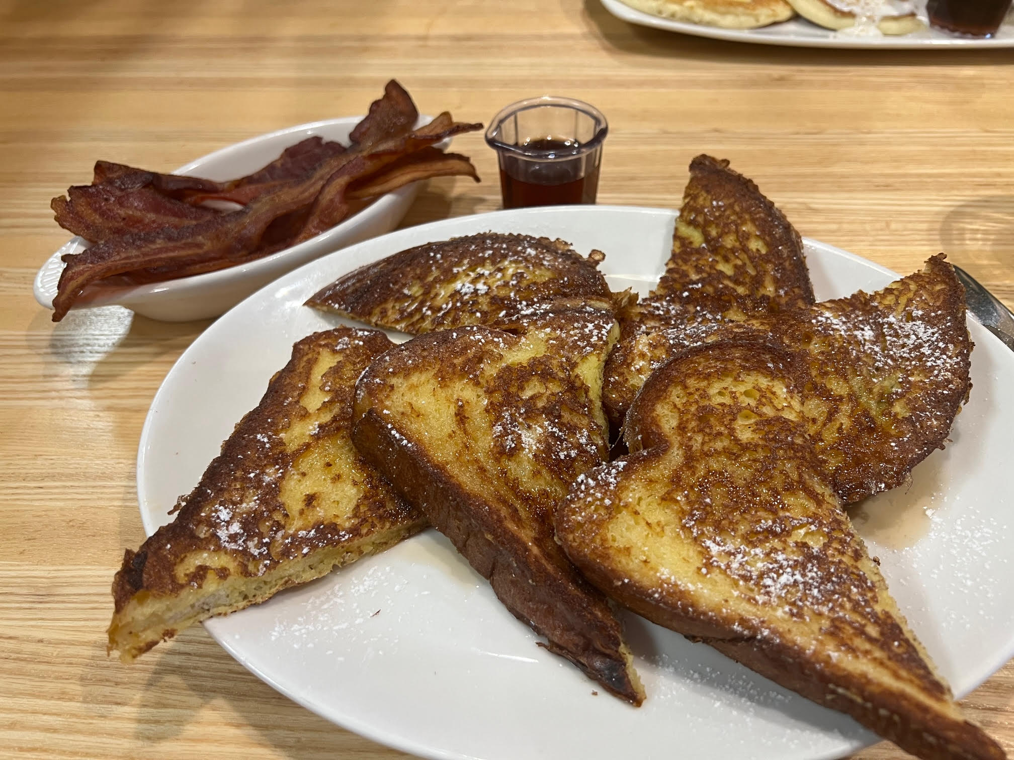For the official Panclog day, I opted for the Traditional French Toast and a side of bacon. The plate included three large pieces of bread, cut on the diagonal, and arranged like a pinwheel on the plate. The petals of the pinwheel surrounded a tiny carafe of maple syrup. The toast had a healthy dusting of powdered sugar adding additional sweetness to each slice.