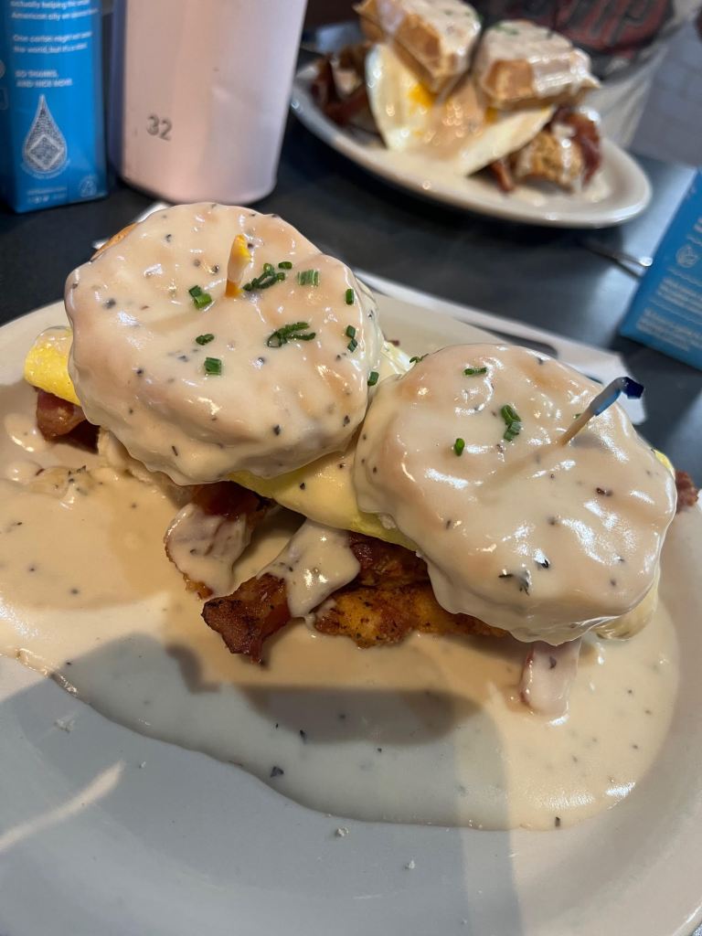 We then knew we had to plan our visit a bit better. We knew we were going to the aquarium the next morning, so we decided to have our fill of southern food before seeing some seals, beluga whales, and even whale sharks! We were seated immediately on arrival to the breakfast club. Our server was delightful. She welcomed us and inquired if we have been to the Atlanta Breakfast Club before. We had not, so she listed out the rules. All meals on one ticket, the whole order put in at one time, and that everything on the menu is good. I was easily persuaded to try the special a Bacon Egg & Cheese Chicken & Waffle smothered in Gravy, a coffee, and cinnamon roll.